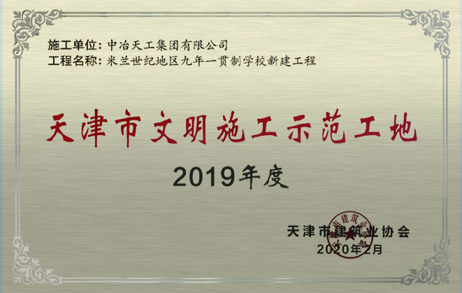 2019年度天津市市级施工示范工地-米兰世纪地区九年一贯制学校新建工程