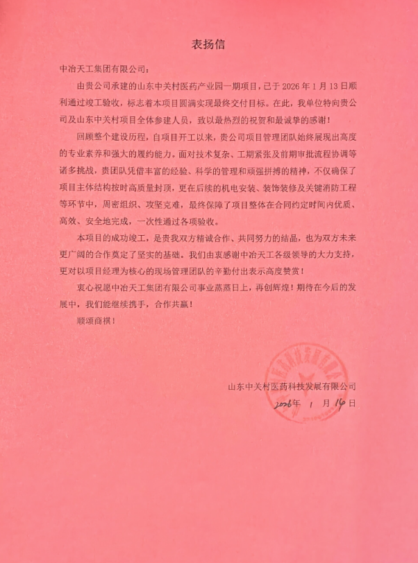信中指出,項目管理團隊憑借豐富的經(jīng)驗、科學的管理和頑強拼搏的精神,不僅確保了項目主體結構按時高質量封頂,更在后續(xù)的機電安裝、裝飾裝修及關鍵消防工程等環(huán)節(jié)中,周密組織、攻堅克難,最終保障了項目整體在合同約定時間內優(yōu)質、高效、安全地完成,一次性通過各項驗收。